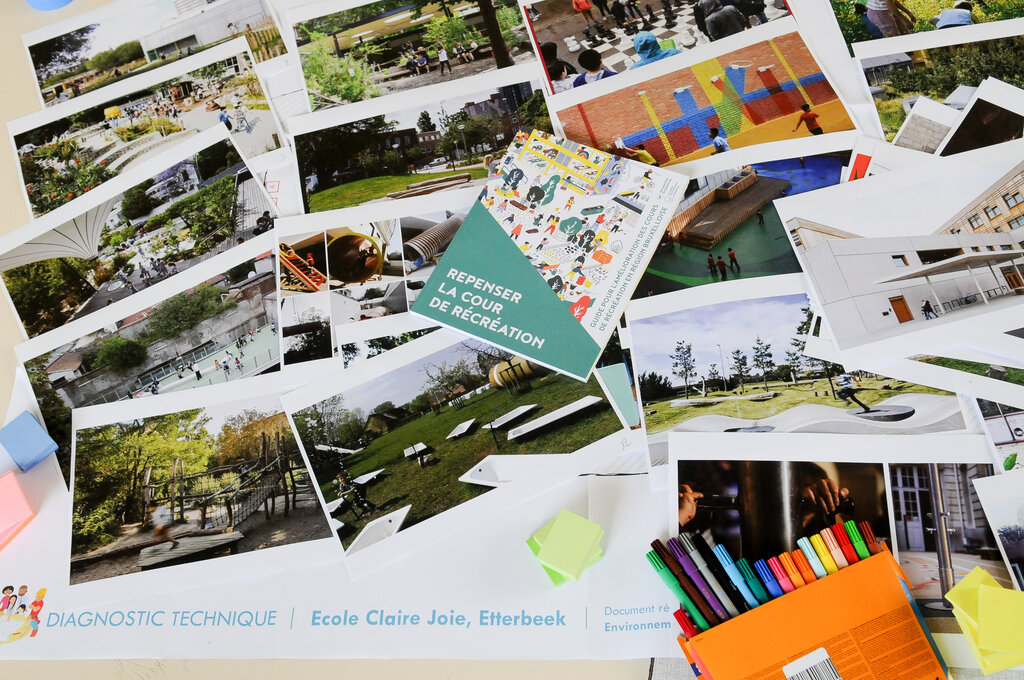 enseignants et enseignantes, concierge et parents d’élèves se sont retrouvés au milieu de la cour pour faire un diagnostic sur site. Après les enfants, c’était au tour du groupe des adultes de repenser la cour de l’école pour y intégrer plus de végétation. Et les idées n’ont pas manqué !