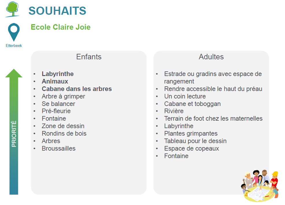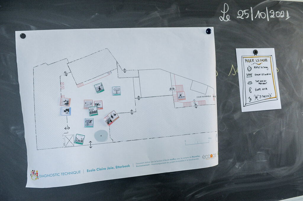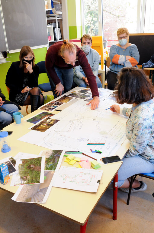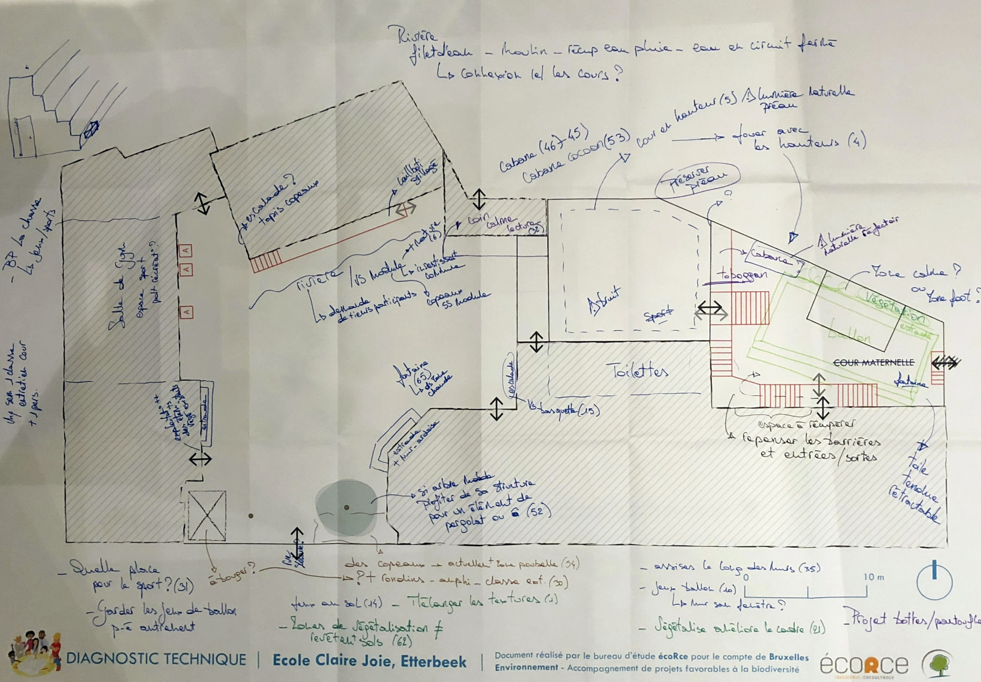 enseignants et enseignantes, concierge et parents d’élèves se sont retrouvés au milieu de la cour pour faire un diagnostic sur site. Après les enfants, c’était au tour du groupe des adultes de repenser la cour de l’école pour y intégrer plus de végétation. Et les idées n’ont pas manqué !