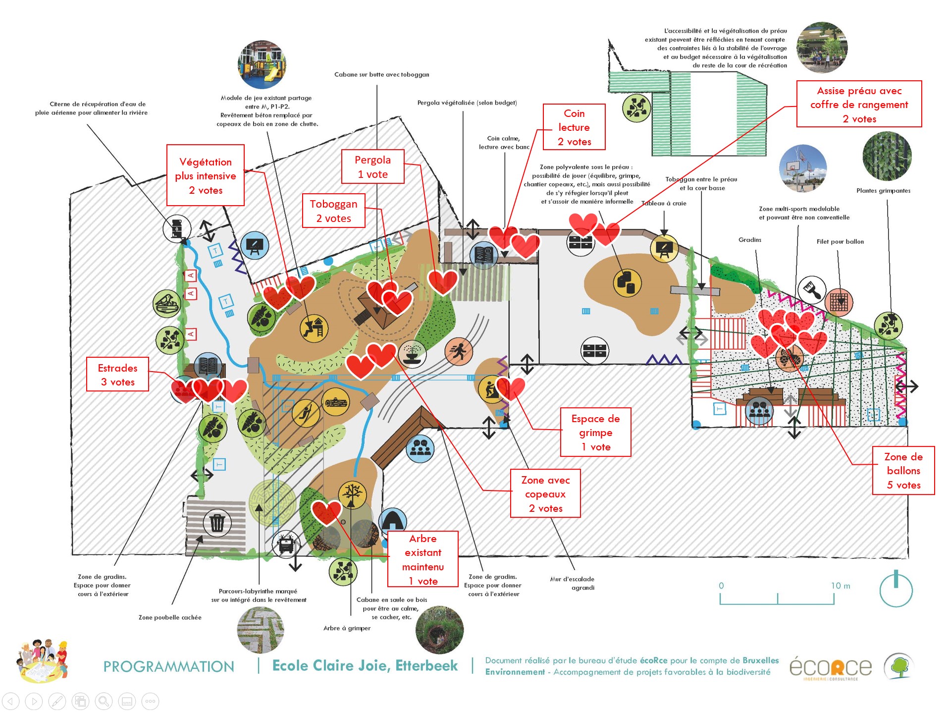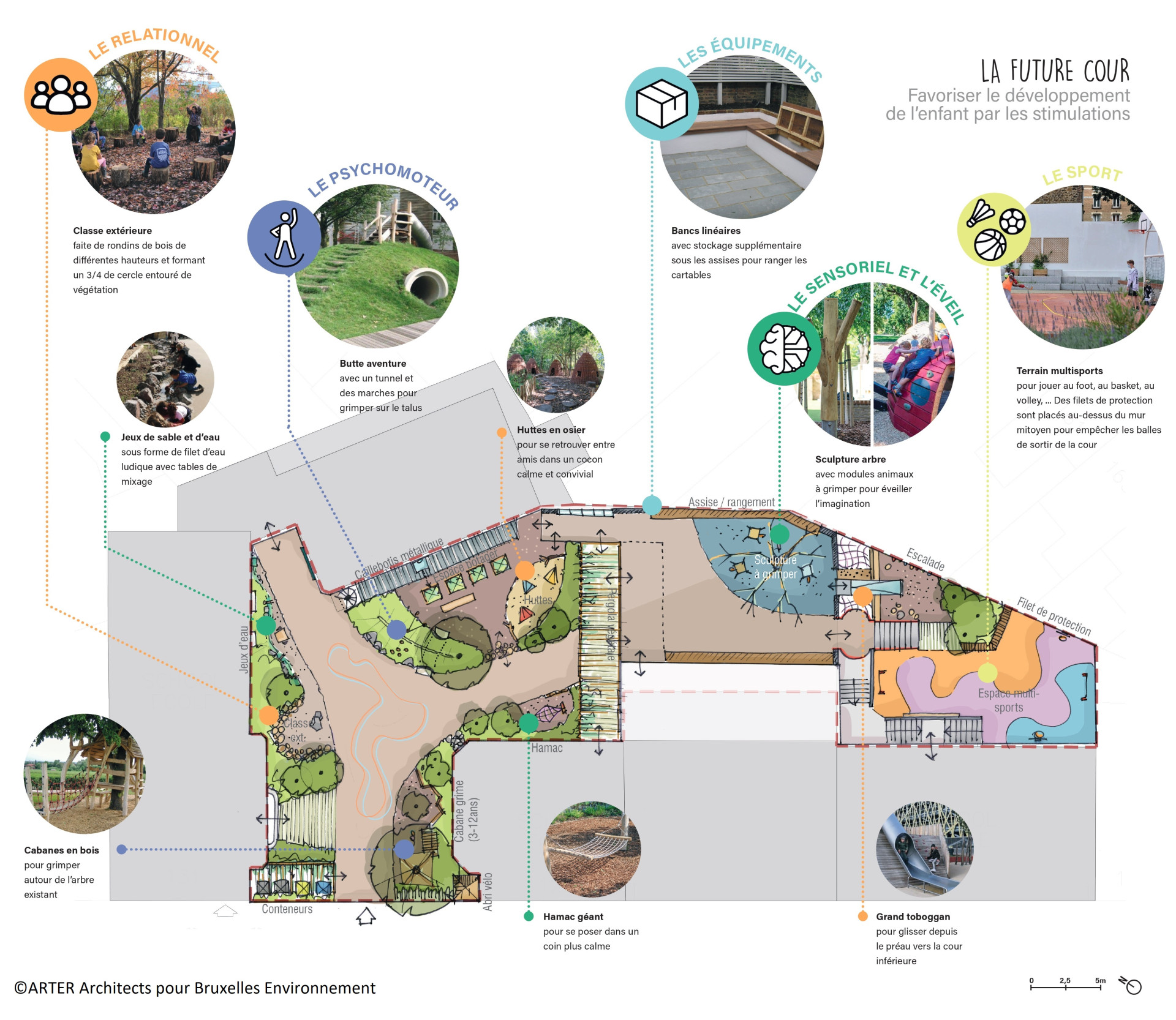 Plus de calme, moins de tensions et plus de créativité dans les jeux ! Il suffit de voir la différence lorsque les enfants ont l’occasion d’aller à l’extérieur, dans un parc, sur le temps de midi : ils sont beaucoup plus calmes, plus concentrés et plus créatifs ! Aujourd’hui, il y a trop de béton. Repenser la cour et la verduriser, c’est donc aussi pouvoir leur proposer des espaces variés et mixtes, aussi bien en termes d’âges que d’activités, tout en intégrant les contraintes pratiques d’entretien et de rangement. C’est le défi relevé par les élèves ambassadeurs de leur classe et les adultes impliqués dans Re-Création !