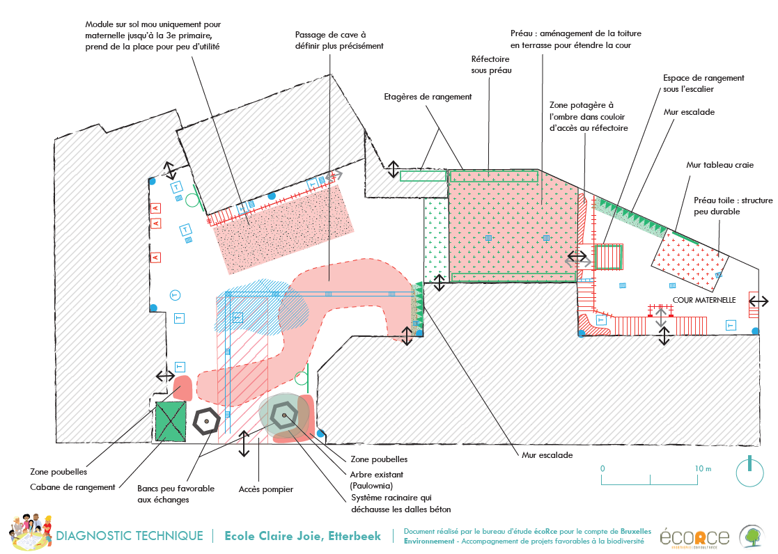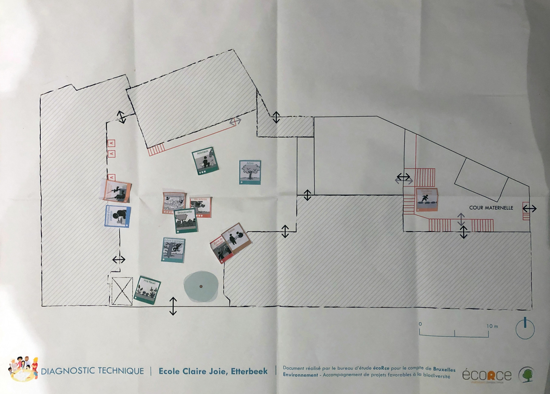 Tout le monde s’accorde à dire que le potentiel est réel. Mais le constat est aussi unanime sur les points faibles de la cour actuelle : l’espace est trop petit, certains coins sont mal exploités, les jeux sont plutôt mobiles et bruyants au détriment d’activités calmes, des îlots de chaleur se forment en été, des flaques en hiver… Sans parler du bruit, amplifié sous le préau, qui rebondit sur les façades. Et puis, le seul arbre de la cour est en bonne santé, mais il est bien seul au milieu de ce béton et ce bitume.