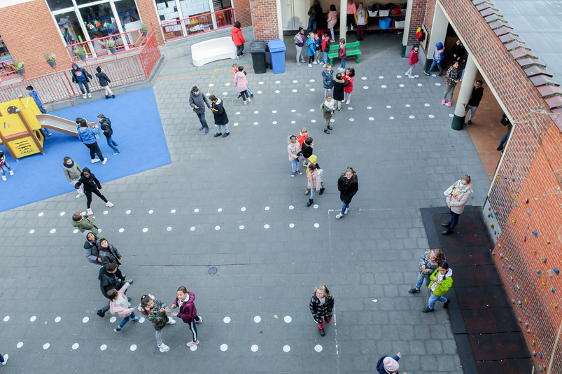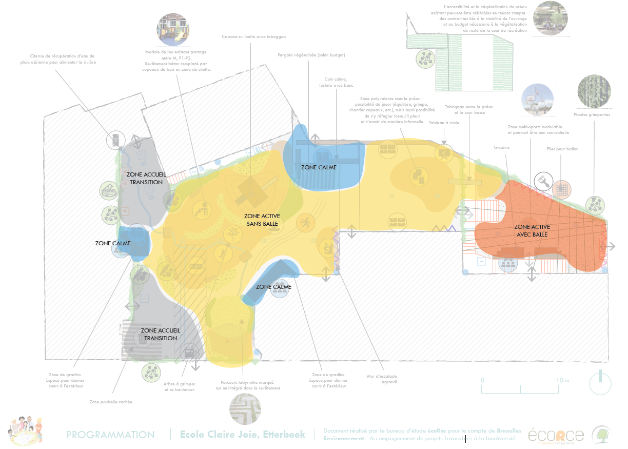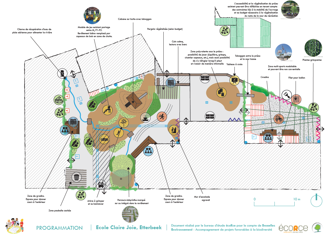 A l’école communale Claire Joie, les quelque 500 élèves de maternelles et de primaires se partagent une cour en trois parties. Sur une surface d’un peu plus de 500m2, la cour est très minérale et encastrée dans le bâti. Si le projet de végétalisation sert évidemment les objectifs pédagogiques de l’école, il vise surtout à améliorer la qualité de vie des enfants, comme l’explique Hélène Van Roy, la directrice.