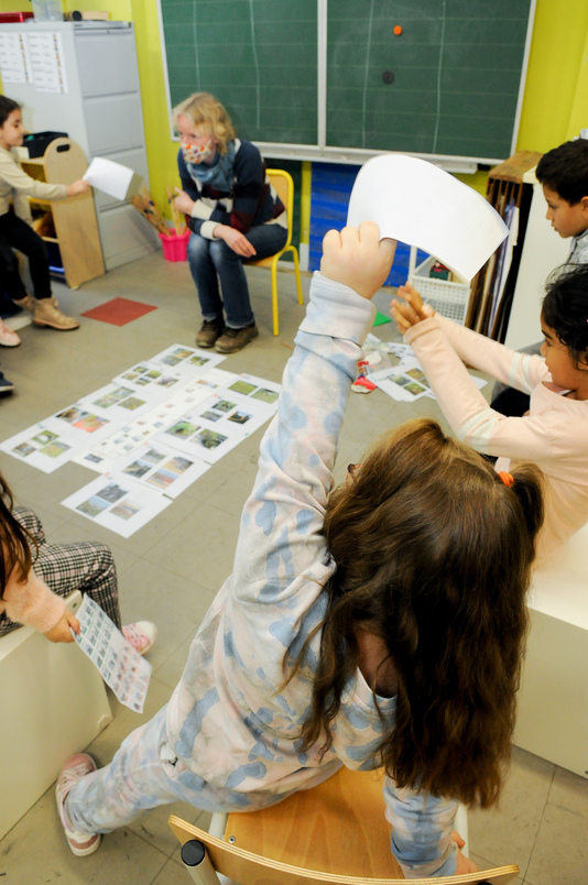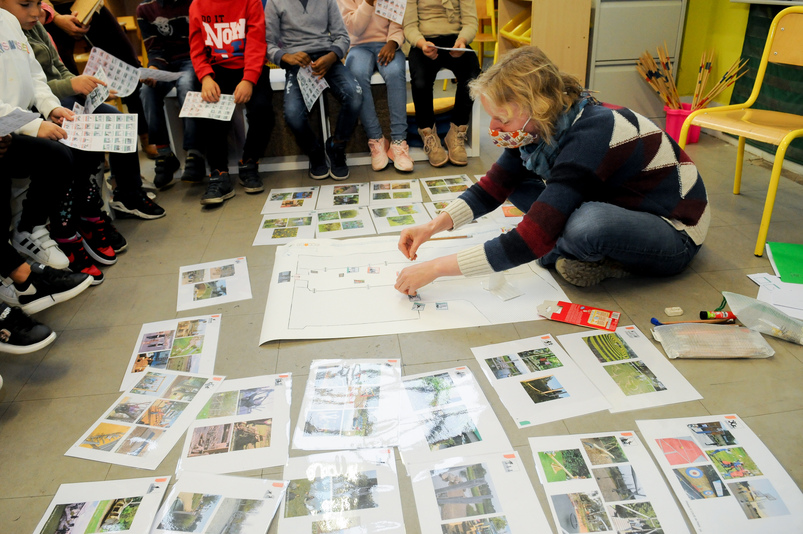 « Tous ensemble contre la pelleteuse pour accueillir la nature dans la cour d’école ! » Le jeu du verger revisité leur permet d’abord de reconnecter la ville et la nature dans leur imaginaire pour mieux envisager ensuite leur cour. Ils s’approprient l’espace à partir de leur expérience : sauter, se rouler dans l’herbe ou faire du toboggan. En imaginant la cour idéale, ils plébiscitent volontiers les jeux de glissade, les zones de sport et les arbres à grimper ou tout ce qui évoque la faune. Reste à déterminer ce qu’il sera possible d’installer dans la cour, aussi bien en termes techniques que d’entretien et de sécurité, mais cet espace végétalisé – qui sera également ouvert au quartier – aura de nombreux bienfaits !