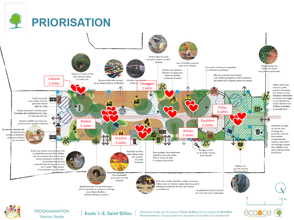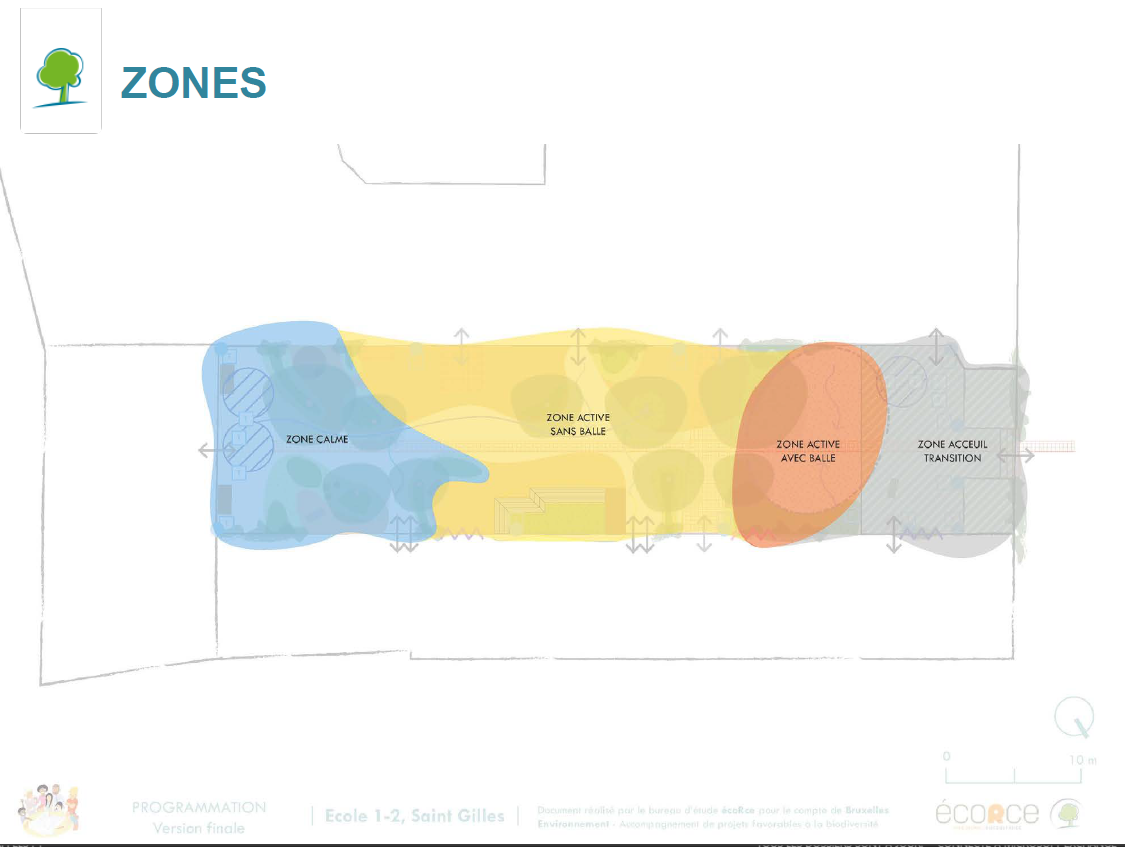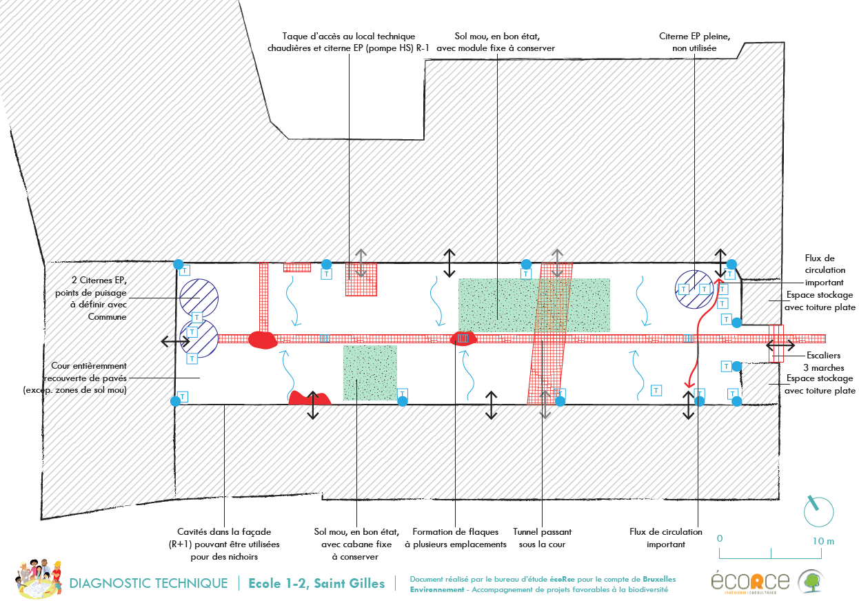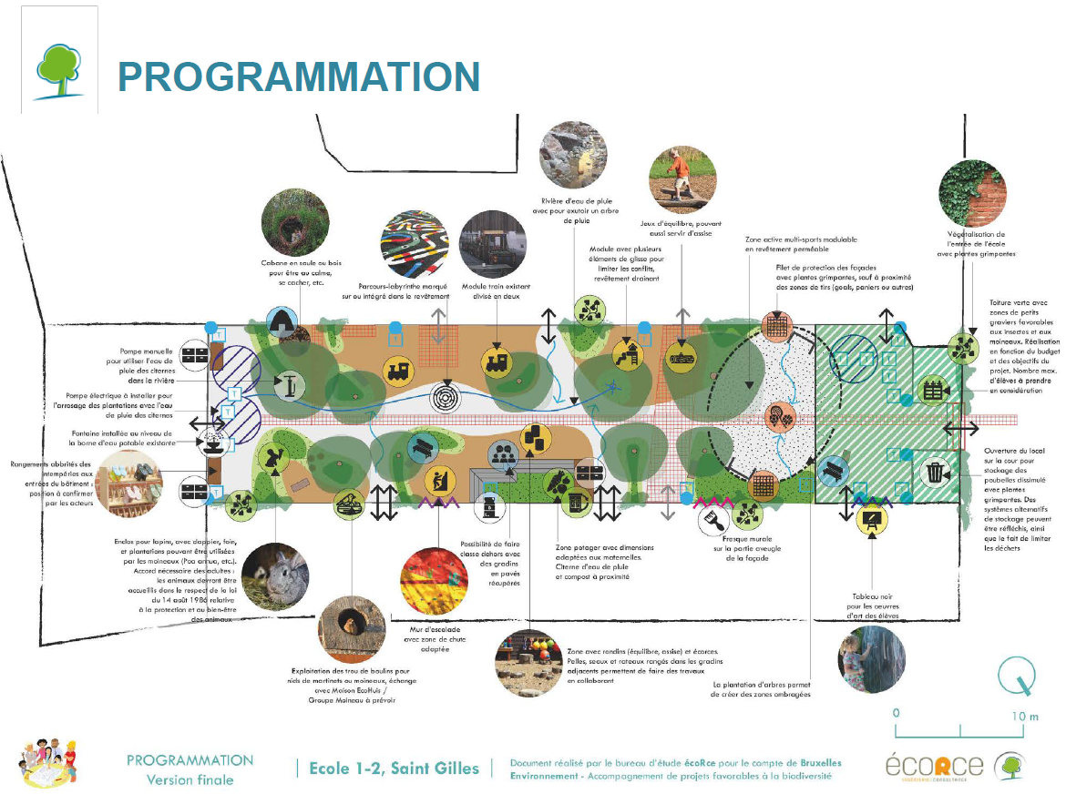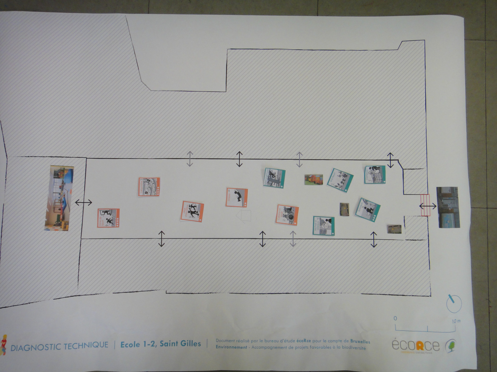 fois un bon point pour la végétalisation à venir et un problème en cas de fortes chaleurs : il faudra en tenir compte, surtout avec de jeunes enfants. Le groupe souligne aussi la présence de nombreux moineaux qui font étape dans les interstices des murs de la cour. Le projet de végétalisation pourrait ainsi s’inscrire parfaitement dans le programme participatif de protection des oiseaux de la Commune de Saint-Gilles.