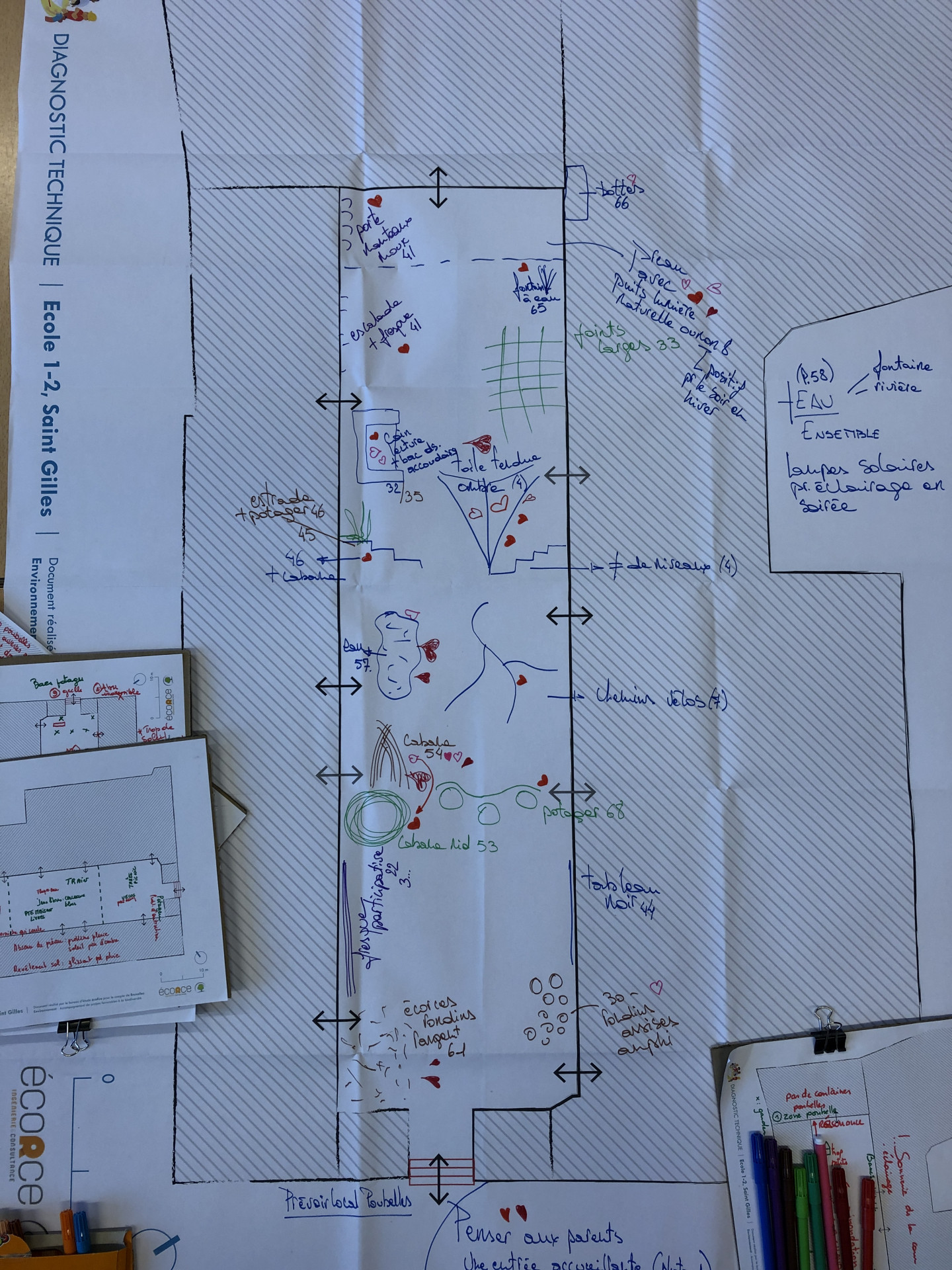 Dans cette école communale à l’ancienne, le constat est clair : la cour est très minérale et la végétation absente, à l’exception de quelques bacs potager. Mais grâce à une bonne orientation, « la cour est aussi très lumineuse » relève une participante. C’est à la