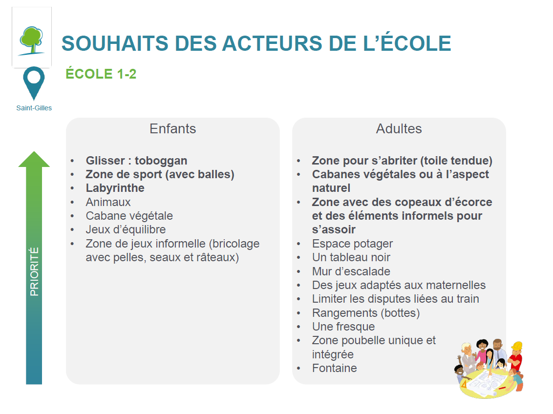 L’équipe exprime surtout sa conviction qu’il faut intégrer ce projet dans une démarche globale, qui implique toute l’école. Introduire de l’eau, de la terre et des végétaux nécessite l’accompagnement des enfants pour respecter les installations et inventer de nouveaux jeux. Les parents doivent être informés des équipements adéquats pour profiter de la cour. L’équipe enseignante réfléchit à la manière d’intégrer les aménagements dans les apports pédagogiques. L’équipe d’entretien veille à ce que ces installations soient bien entretenues pour durer. La suite du processus est attendue avec impatience : la présentation d’un pré-projet à rediscuter ensemble.