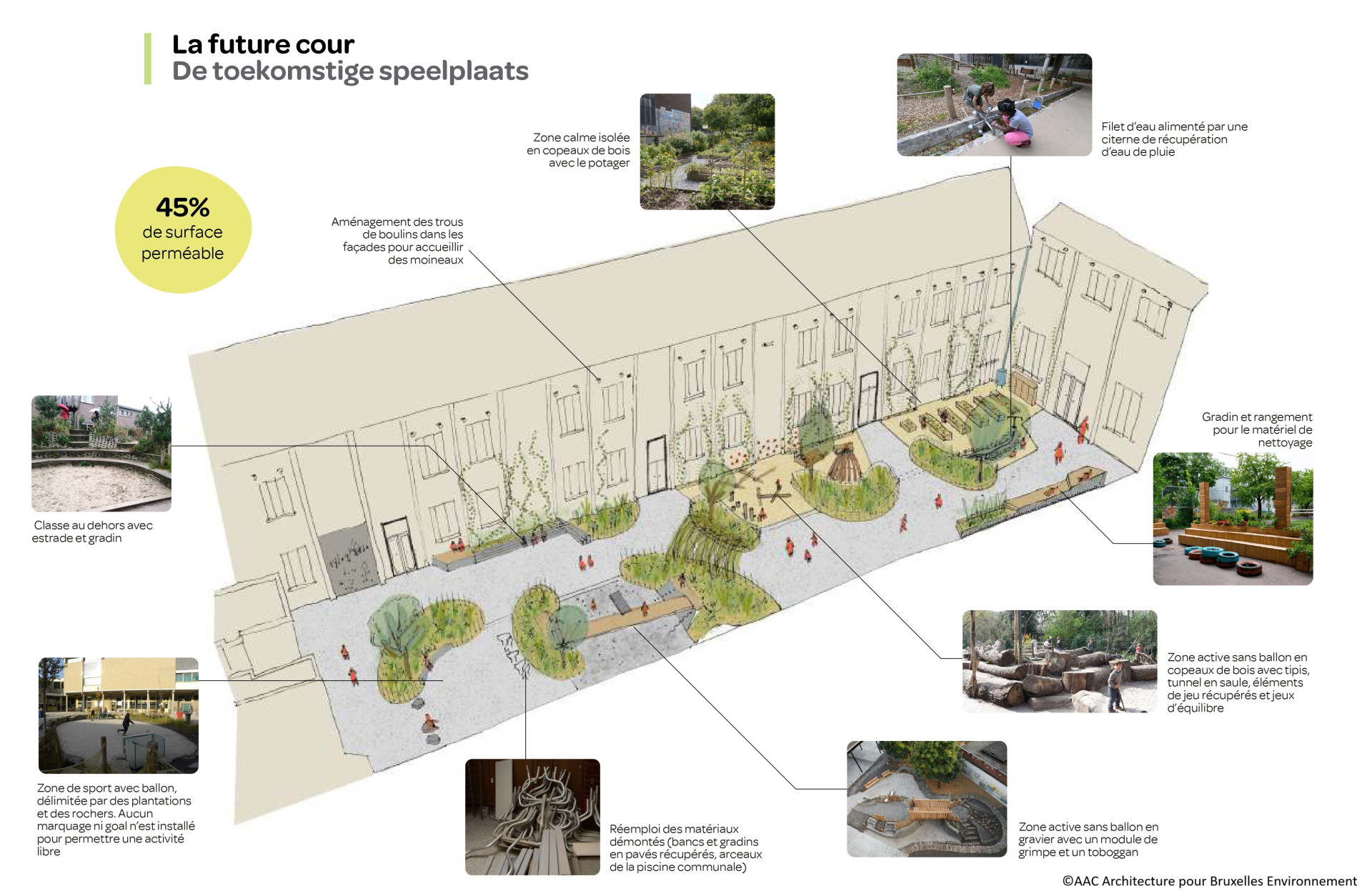Cette école est accompagnée par un consortium composé du bureau d’architecture AAC Architecture, du studio d’architecture de paysage et de design urbain l’Atelier Caneva-s, de l’agence de design et de développement OSMOS Network et du bureau d’étude et de conseil ARIES consultants, mandatés par Bruxelles Environnement.