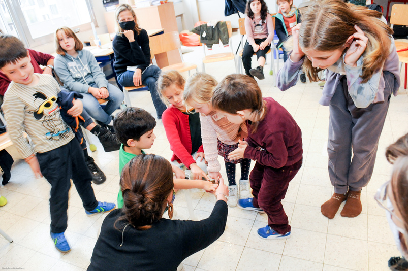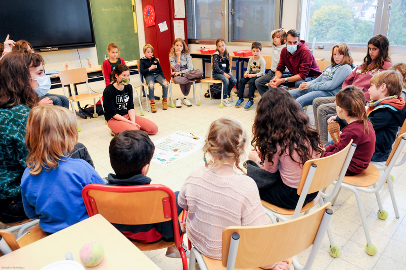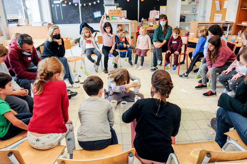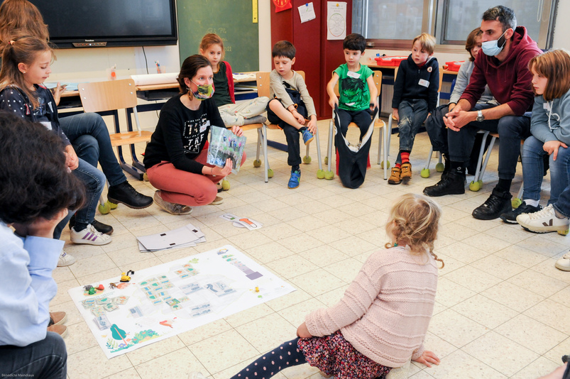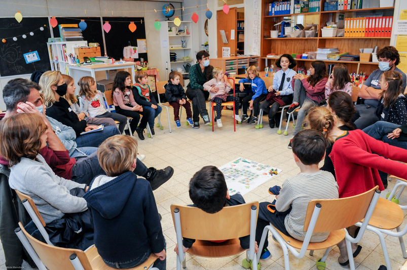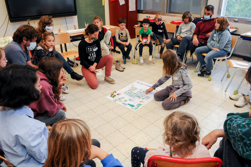 En ce mercredi d’octobre, le personnel de l’école – professeurs, accueillants, surveillants – ainsi qu’une représentante des parents, sont invités à contribuer au projet Ré-création. Isabelle Gallet, Directrice de l’établissement, constate que le défi est relevé avec enthousiasme : « Nous en avions discuté avec l’association des parents, qui percevait très positivement les perspectives de changement ». Les enseignant∙es qui avaient introduit la candidature au nom de l’école sont ravis d’assister