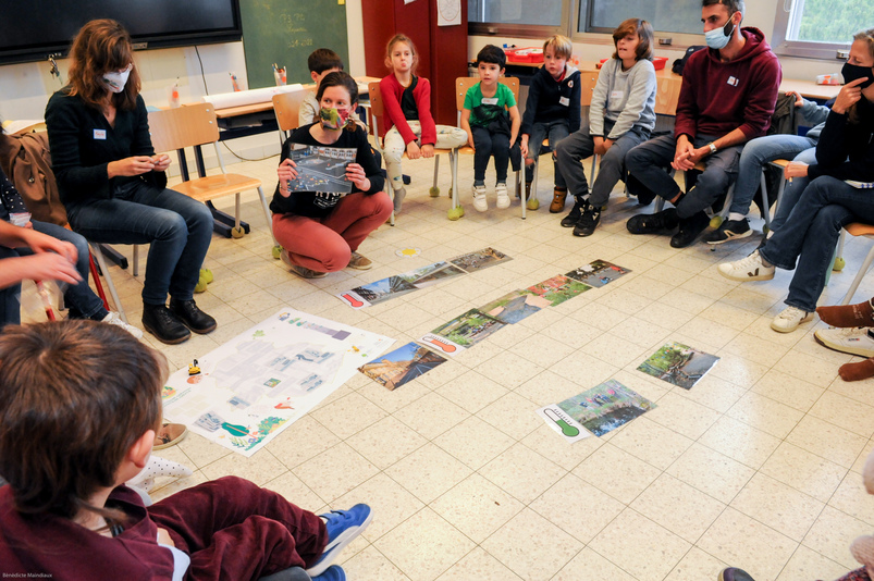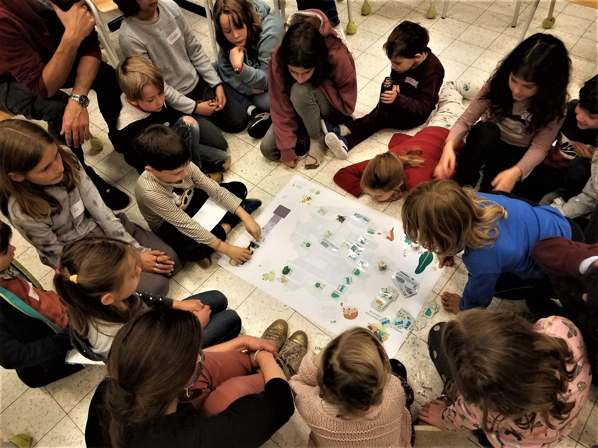 imaginer la cour de récré. La grenouille, le rouge-gorge, l’abeille et le hérisson sont à l’extérieur de la ville. Comment leur permettre d’arriver jusque dans la cour ? Chacun d’entre eux a ses propres besoins pour s’installer et se sentir bien ! C’est l’occasion pour les enfants de réfléchir à l’aménagement d’une ville. Lili place un buisson à côté du hérisson, pour qu’il puisse avancer d’une case et se rapprocher de la cour. Alice constate que la grenouille n’avance pas beaucoup, ce serait bien de lui prévoir une mare ! « Il y a trop de ville et pas assez de nature » constate Eva. L’occasion pour Tournesol de rappeler l’importance d’un maillage vert en ville, pour permettre à la biodiversité de se développer, sans empêcher la vie en ville, les déplacements, le travail… Et dans la cour de récré, c’est pareil !