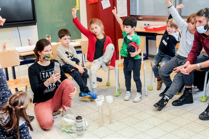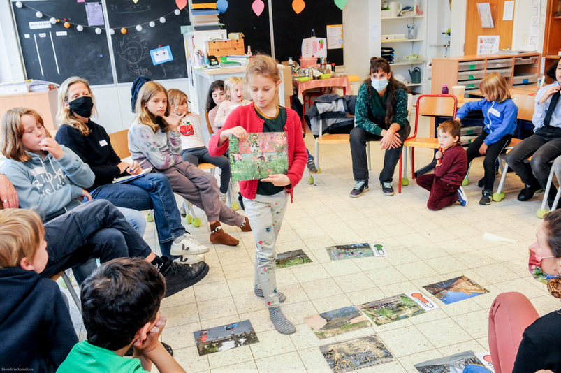 La nature permet d’apprendre, observer, jouer, respirer, manger ou découvrir la biodiversité… autant d’éléments abordés lors de cette séance de sensibilisation animée par l’asbl Tournesol. Les enfants sont invités à partager leur expérience : « Dehors, on fait des concours de marrons ! », « C’est chouette d’avoir de l’ombre sous les arbres en été », « On a déjà une petite mare, dans laquelle on a mis une grenouille ! », « Ce serait chouette d’avoir un mur d’escalade, un pont de singe, un tapis de fleur, des hérissons… ». Les discussions s’activent et les idées foisonnent !