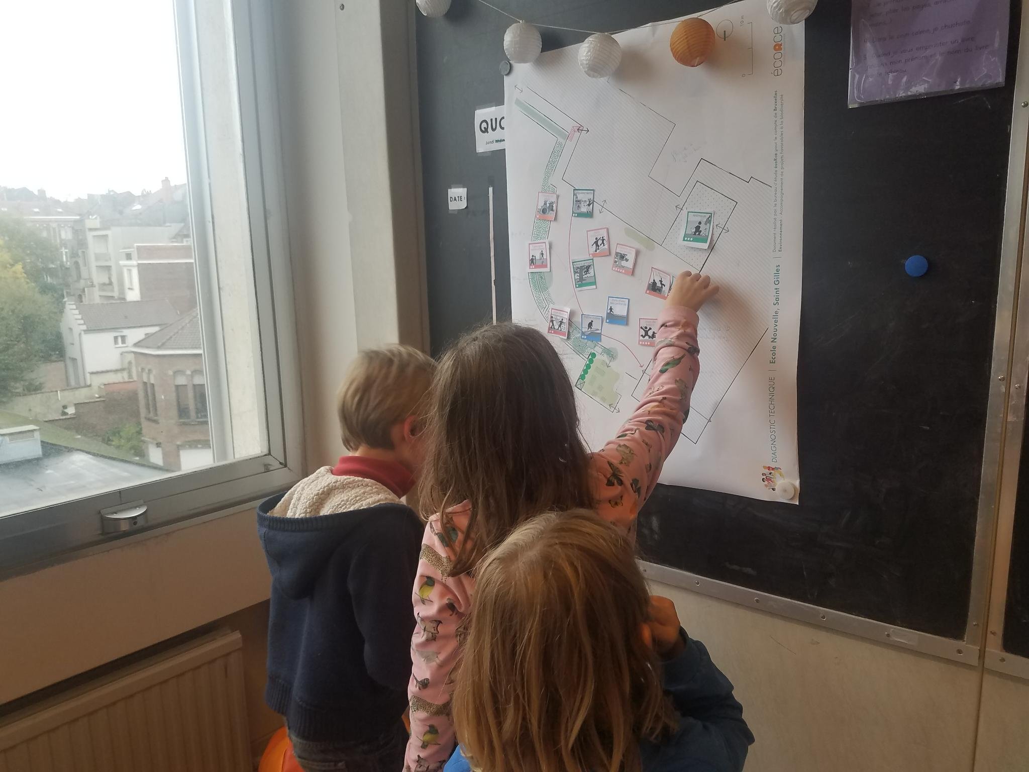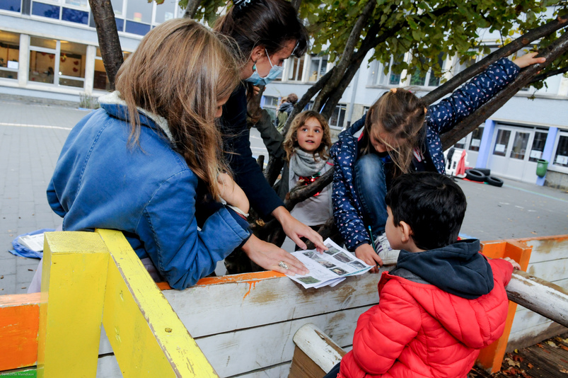 Les enfants sont ensuite invités à faire un diagnostic de leur cour actuelle. Qu’est-ce qu’on y trouve aujourd’hui ? Des arbres, des arbustes, des troncs d’arbres morts, de l’herbe, des orties ? Des champignons, des fruitiers, un potager ? De vieilles pierres ? Un hôtel à insectes ? Un abri pour les oiseaux ? L’occasion de (re)découvrir ce qui s’y trouve, et d’imaginer ce qu’on pourrait y ajouter pour une cour de récré idéale ! Si les aménagements concrets prendront un peu de temps (environ 2 ans), les enfants sont ravis de s’investir dans le projet, comme l’exprime Samy. « Ce sera chouette pour nos petits frères et sœurs ».
