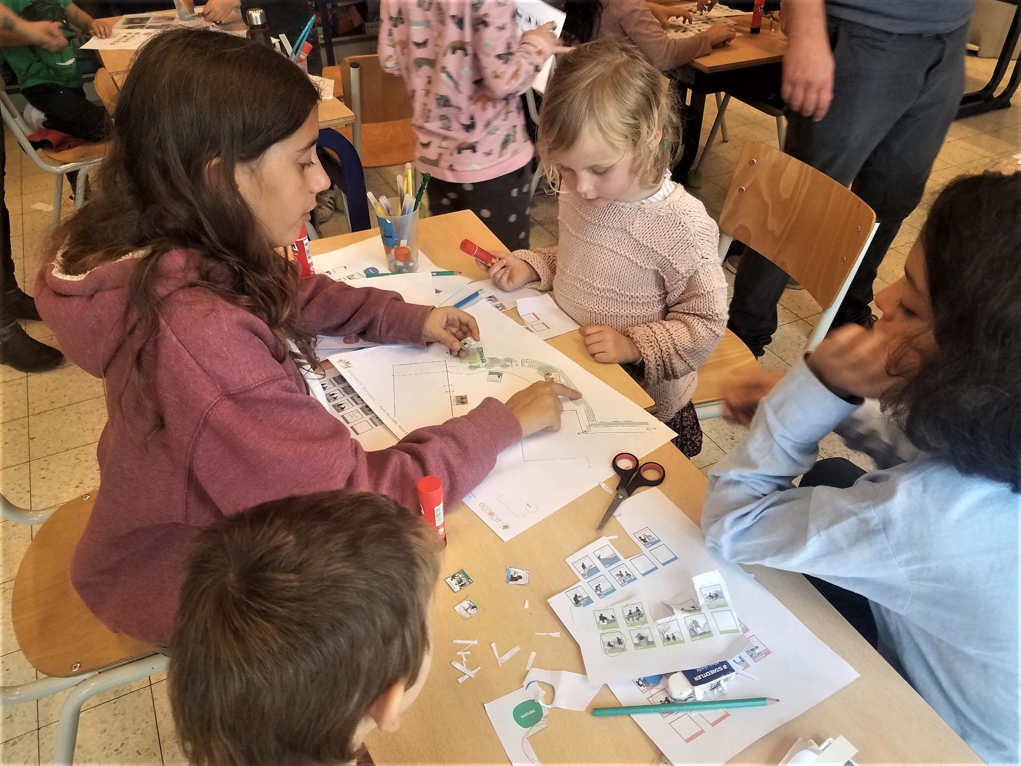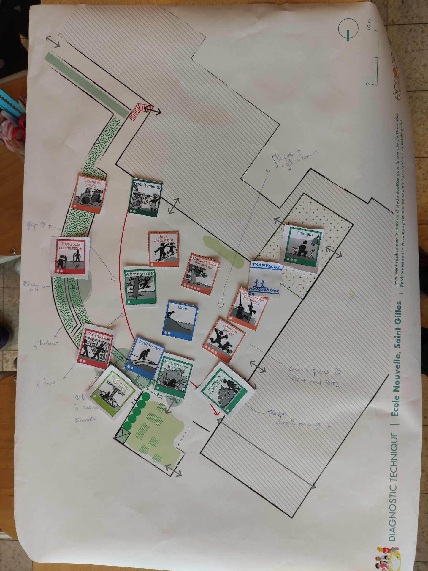 La rencontre commence par un tour de la cour, pour identifier les atouts et les améliorations nécessaires. Pour ce diagnostic, les adultes sont invités à penser aux besoins des enfants qu’ils côtoient au quotidien, tout en veillant à leur sécurité et à leur bien-être. On assiste à l’émergence des craintes et des envies de chacun. Les participants constatent notamment que la cour ne dispose pas d’espace protégé en cas de mauvais temps, et qu’il y a peu d’espace abrité en cas de forte chaleur. En termes d’espaces de jeux, la superficie de la cour est petite compte tenu du nombre d’enfants, il est donc difficile de permettre les jeux de ballon, notamment. Les aspects positifs sont également valorisés :