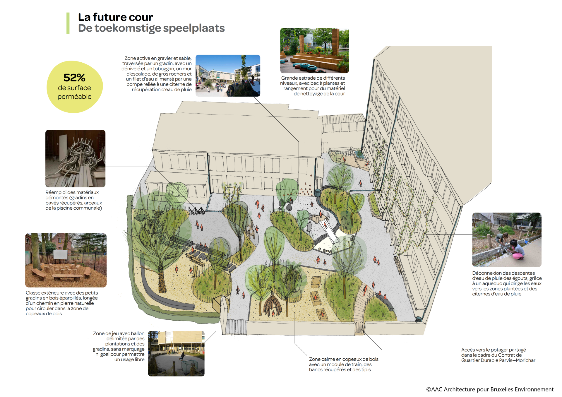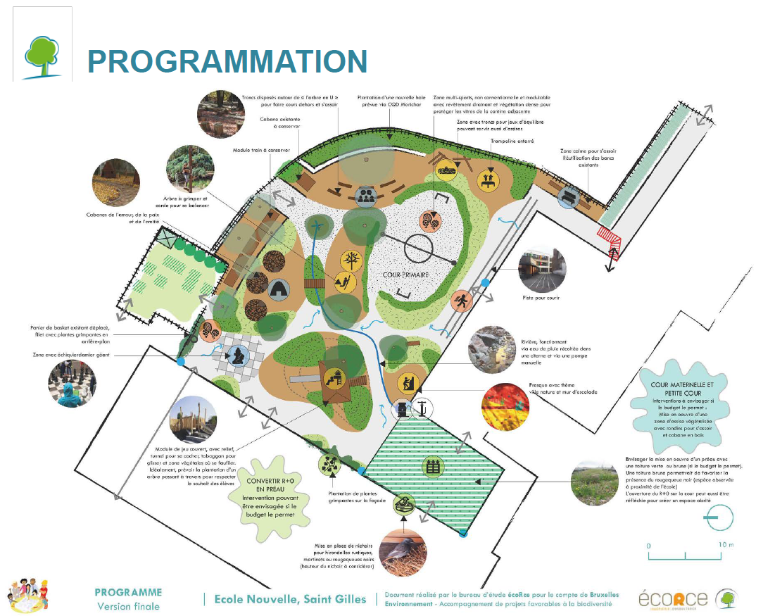 Cette école est accompagnée par un consortium composé du bureau d’architecture AAC Architecture, du studio d’architecture de paysage et de design urbain l’Atelier Caneva-s, de l’agence de design et de développement OSMOS Network et du bureau d’étude et de conseil ARIES consultants, mandatés par Bruxelles Environnement.