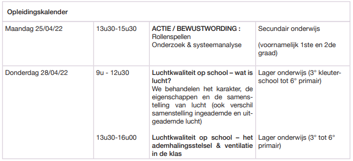 Deze opleiding kan verdergezet worden in de opleiding ‘Luchtkwaliteit op school – het ademhalingsstelsel & ventilatie van de klas‘ – te volgen in de namiddag.