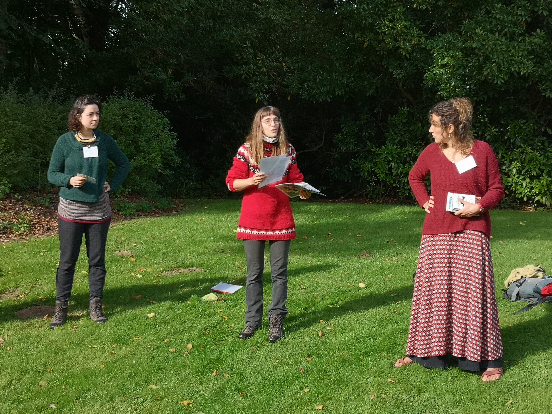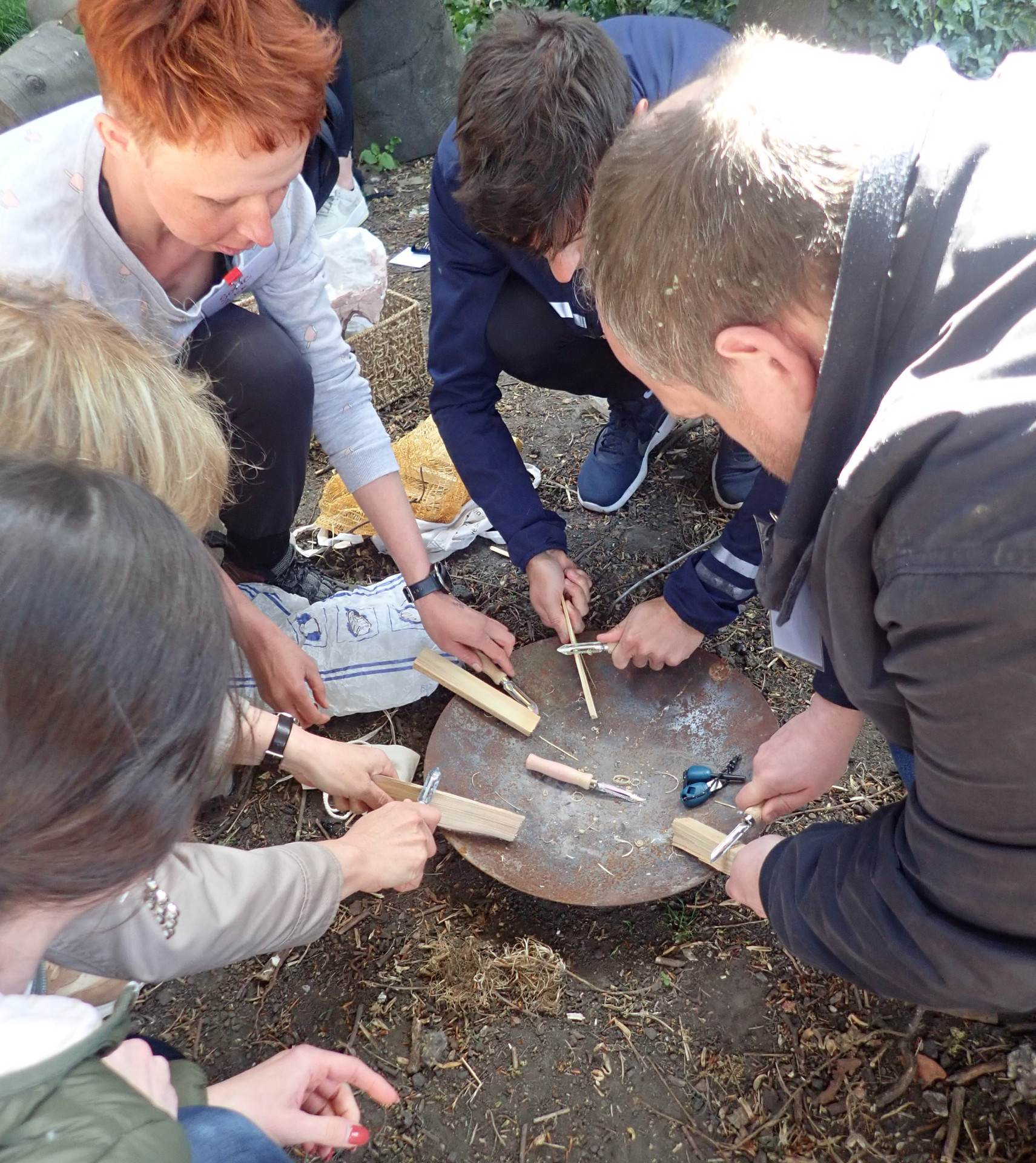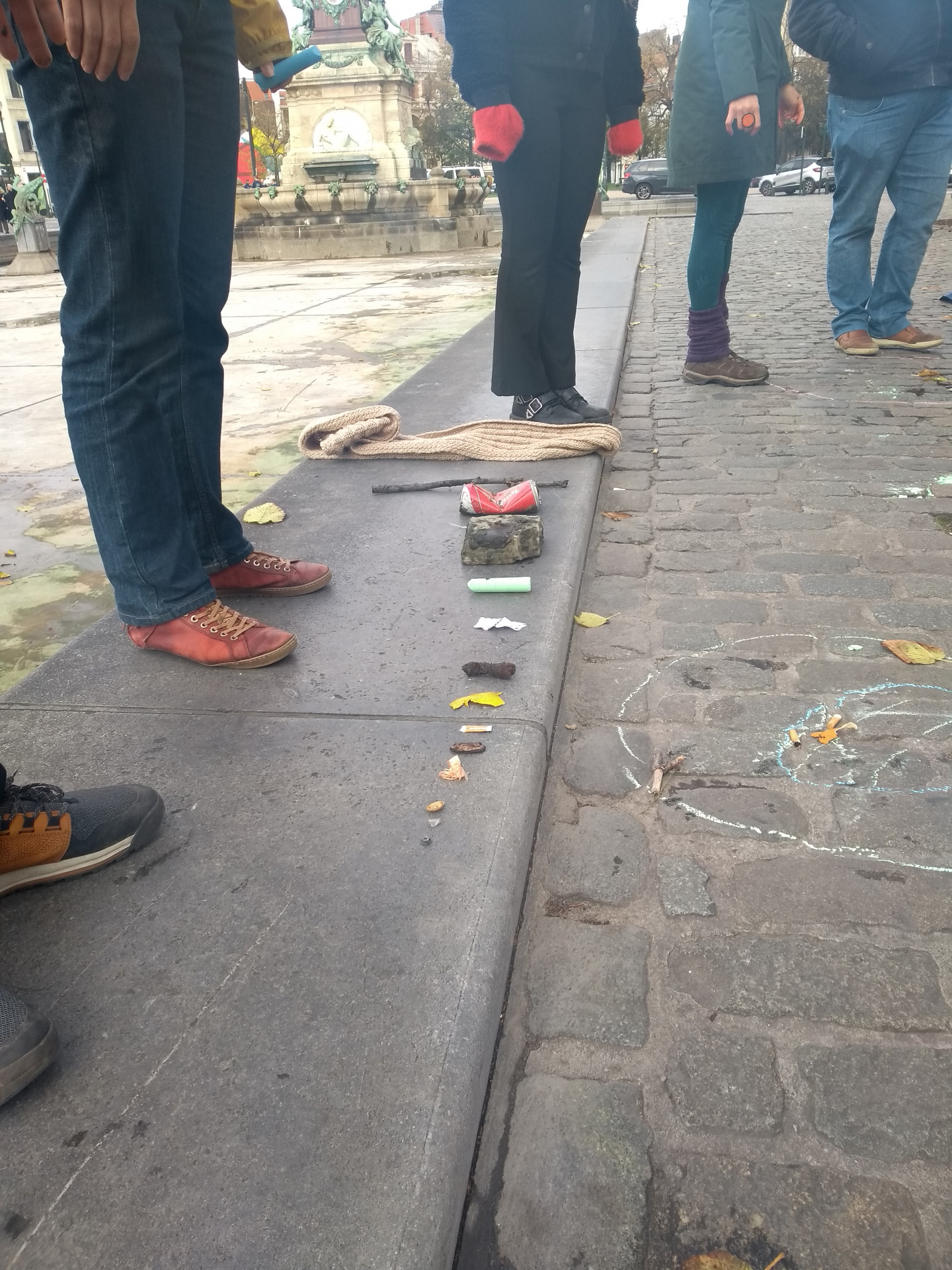 In het Marie-Josépark te Molenbeek startten we met een ludieke en verkwikkende opwarming. Daarna kregen de leerkrachten de kans om buitenactiviteiten te bedenken aan de hand van enkele gegeven onderwerpen (een leerdomein, een materiaal of een thema). Hun ideeën versterkten elkaar waardoor ze tot uitdagende en zintuigprikkelende activiteiten kwamen. We gingen elk op zoek naar een tak die ons op het einde nog van pas zou komen.
