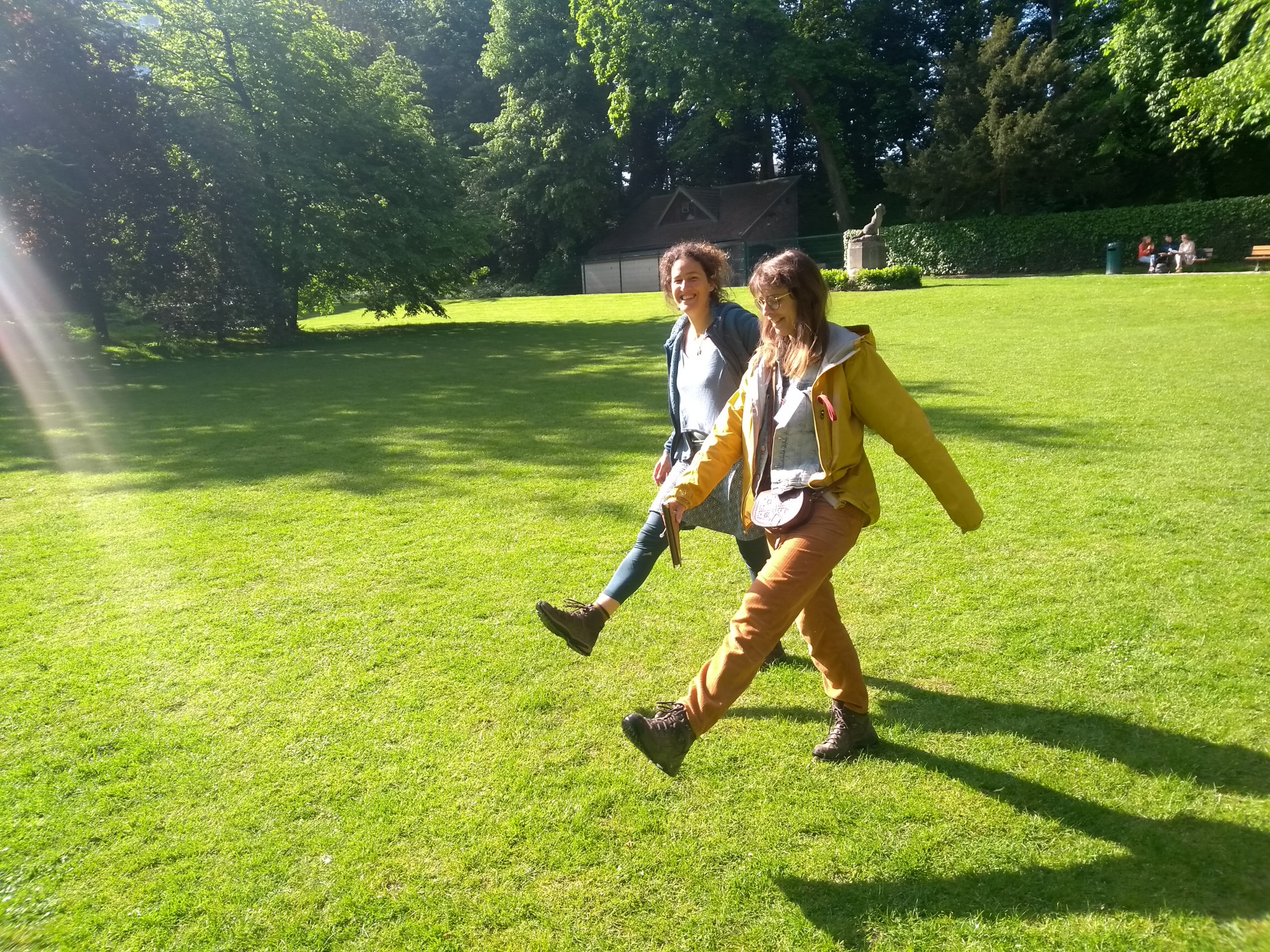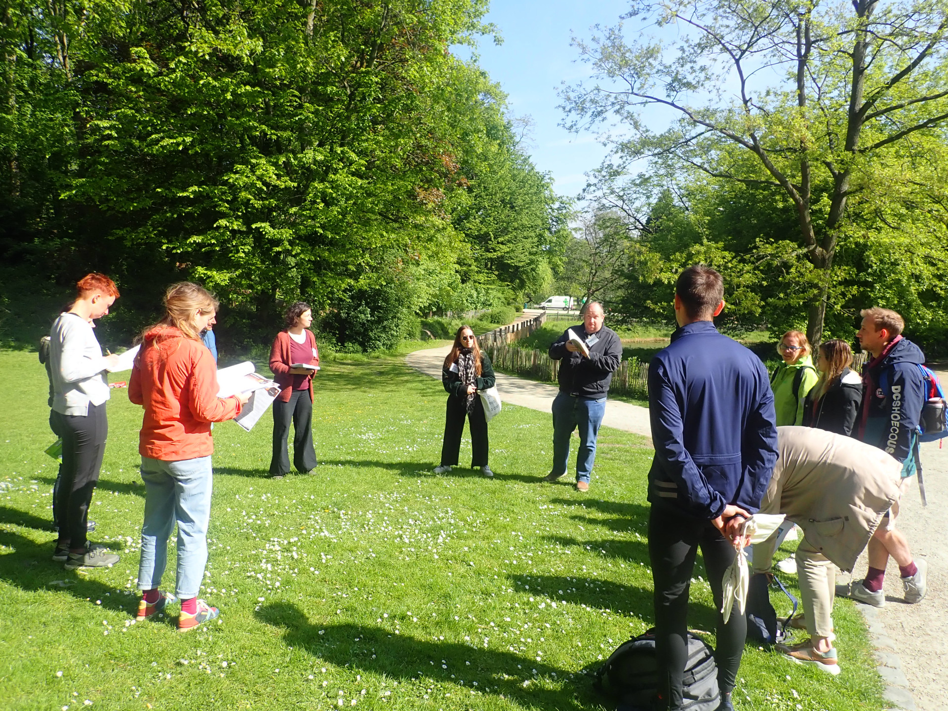De deelnemers maakten kennis met elkaar bij het Centrum van vzw Tournesol-Zonnebloem in Bosvoorde om daarna samen op pad te gaan naar het Tournay-Solvay Park. Ze kregen al meteen een eerste opdracht: wandel in stilte en observeer. De zon kwam erdoor en de vogels floten. Ze zochten een ideale plek in het gras en gingen zelf aan de slag met de roepen van verschillende vogels.