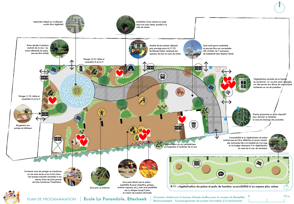 La Farandole, een school met 340 leerlingen, beschikt slechts over één speelplaats, waarvan de afmetingen en de indeling de speelzones sterk beperken. Alleen de kinderen van de kleuterschool kunnen genieten van een stukje natuur, zij het heel beperkt. Het team is er echter van overtuigd dat de aanwezigheid van natuur een bron van welzijn en responsabilisering is.