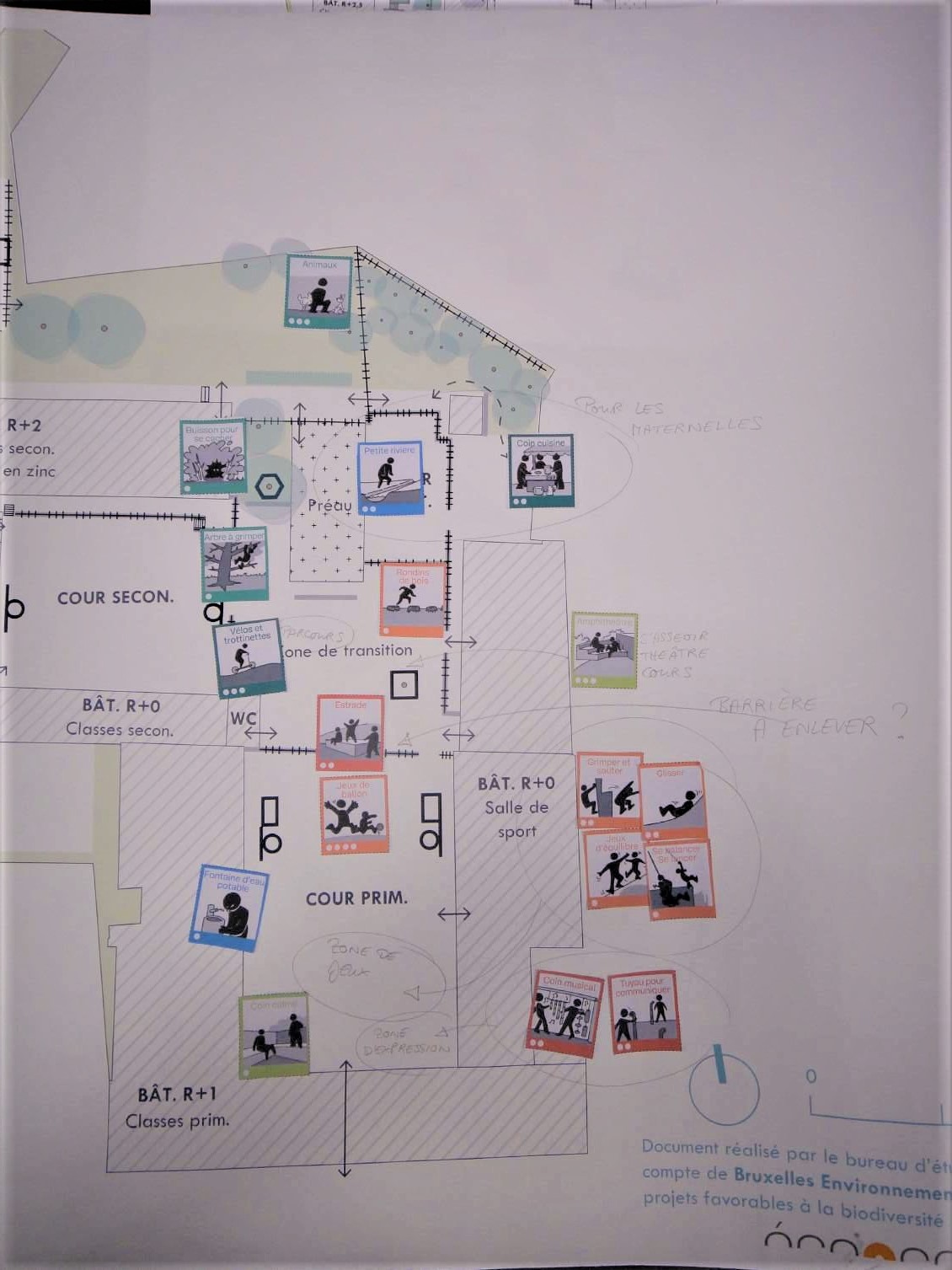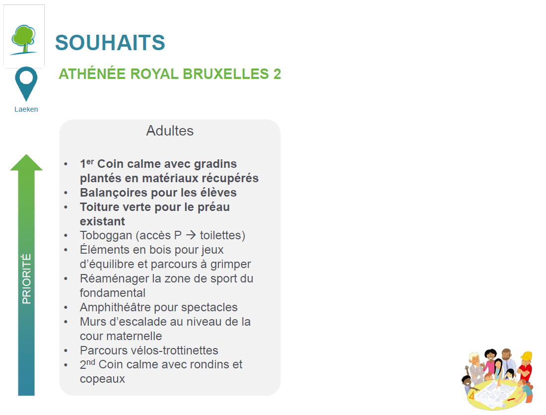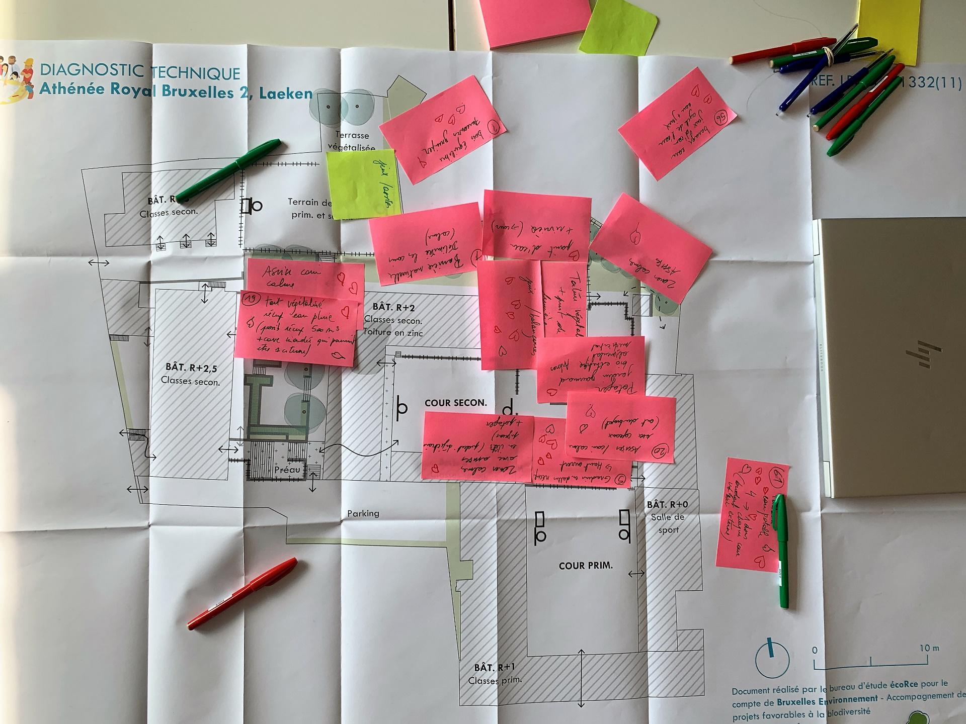Un autre groupe travaille sur les ilots de fraicheur. « La cour est entourée de béton. Hier, en plein mois de février, nous étions en t-shirt. A l’inverse, la zone du potager est plus fraiche grâce aux plantations qui s’y trouvent », explique Ryan. Les propositions fusent de planter plus d’arbres et surtout, de changer le revêtement du sol. « Les élèves souhaitent garder et même augmenter la surface du potager. C’est encourageant pour le travail que nous fournissons depuis plusieurs années », explique Monsieur Liesenborghs, professeur de sciences depuis 20 ans à l’Athénée Royal Bruxelles 2 et l’un des porteurs du projet Opération Ré-création au sein de l’école.