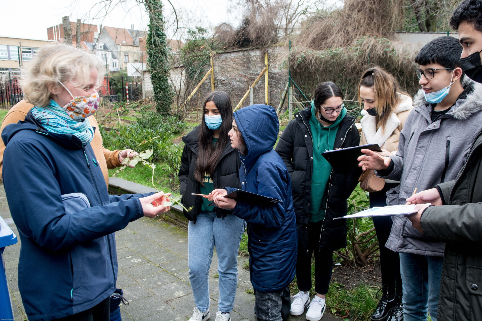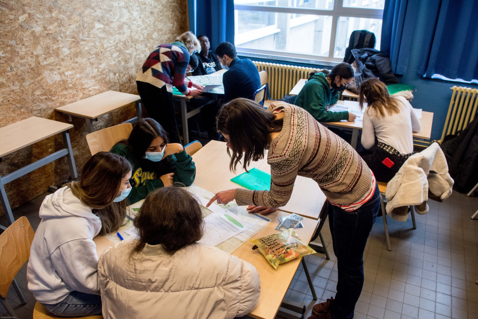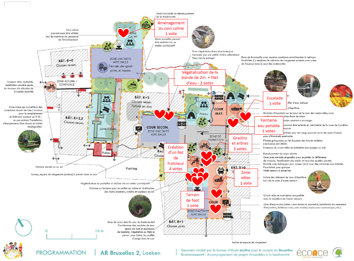 Un autre groupe travaille sur les ilots de fraicheur. « La cour est entourée de béton. Hier, en plein mois de février, nous étions en t-shirt. A l’inverse, la zone du potager est plus fraiche grâce aux plantations qui s’y trouvent », explique Ryan. Les propositions fusent de planter plus d’arbres et surtout, de changer le revêtement du sol. « Les élèves souhaitent garder et même augmenter la surface du potager. C’est encourageant pour le travail que nous fournissons depuis plusieurs années », explique Monsieur Liesenborghs, professeur de sciences depuis 20 ans à l’Athénée Royal Bruxelles 2 et l’un des porteurs du projet Opération Ré-création au sein de l’école.
