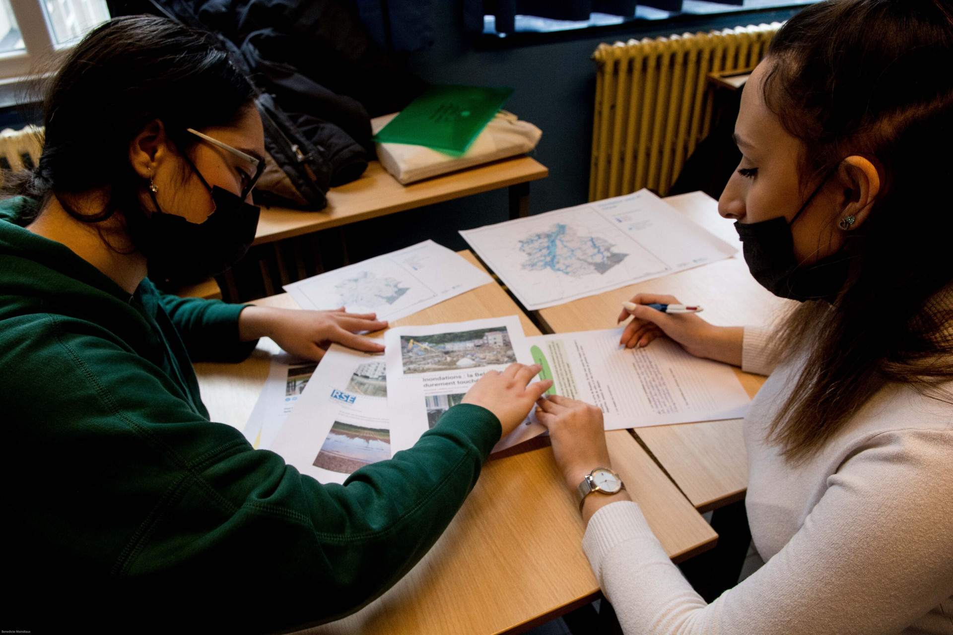 Hasiba et Kansel travaillent sur la gestion de l’eau. En découvrant les documents du dossier pédagogique, elles prennent connaissance d’articles de journaux parlant des inondations survenues l’été 2021. « C’est tellement triste pour les écoles qui ont été inondées. Ça aurait pu se passer chez nous. Nous sommes situés à un point très bas de Bruxelles. Les classes près des toilettes ont d’ailleurs failli être sous eau », explique Hasiba. Que faire pour éviter ces évènements météorologiques extrêmes ? « Il devrait y avoir beaucoup plus de végétal dans la cour pour absorber l’eau. Dès qu’il pleut, la cour est remplie de flaques d’eau. Rien n’est absorbé », propose Kansel.