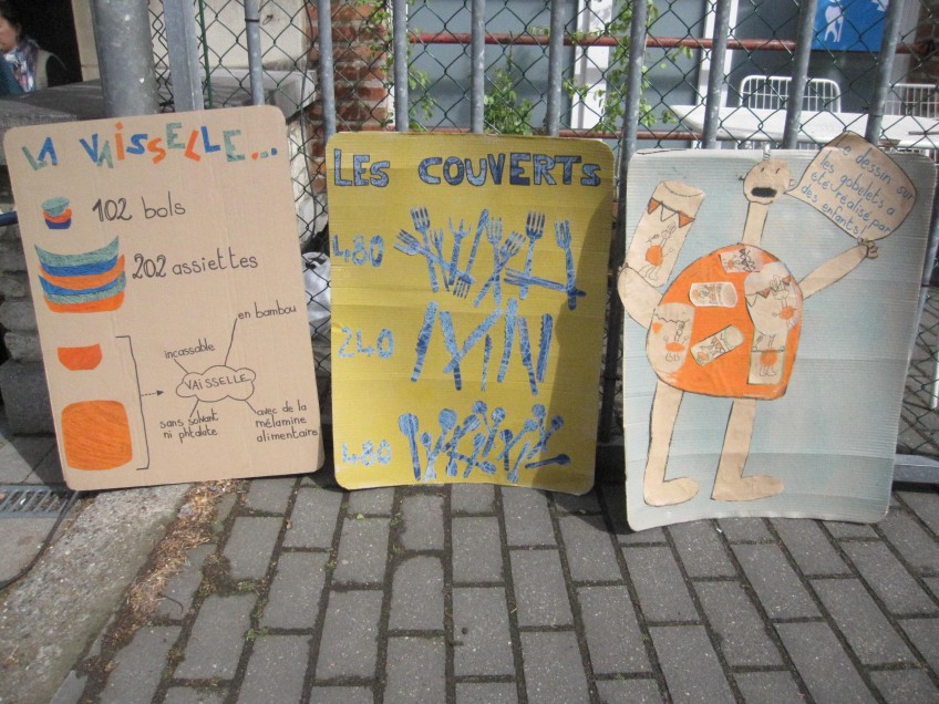 En effet, l’école essaie déjà d’appliquer le tri sélectif et la réduction des déchets tout au long de l’année mais il est parfois difficile de communiquer cela aux parents. Des panneaux d’informations sur la vaisselle ont été créés et la vaisselle a été utilisée aux réunions de parents pour renforcer le message de réduction de déchets par la réutilisation.