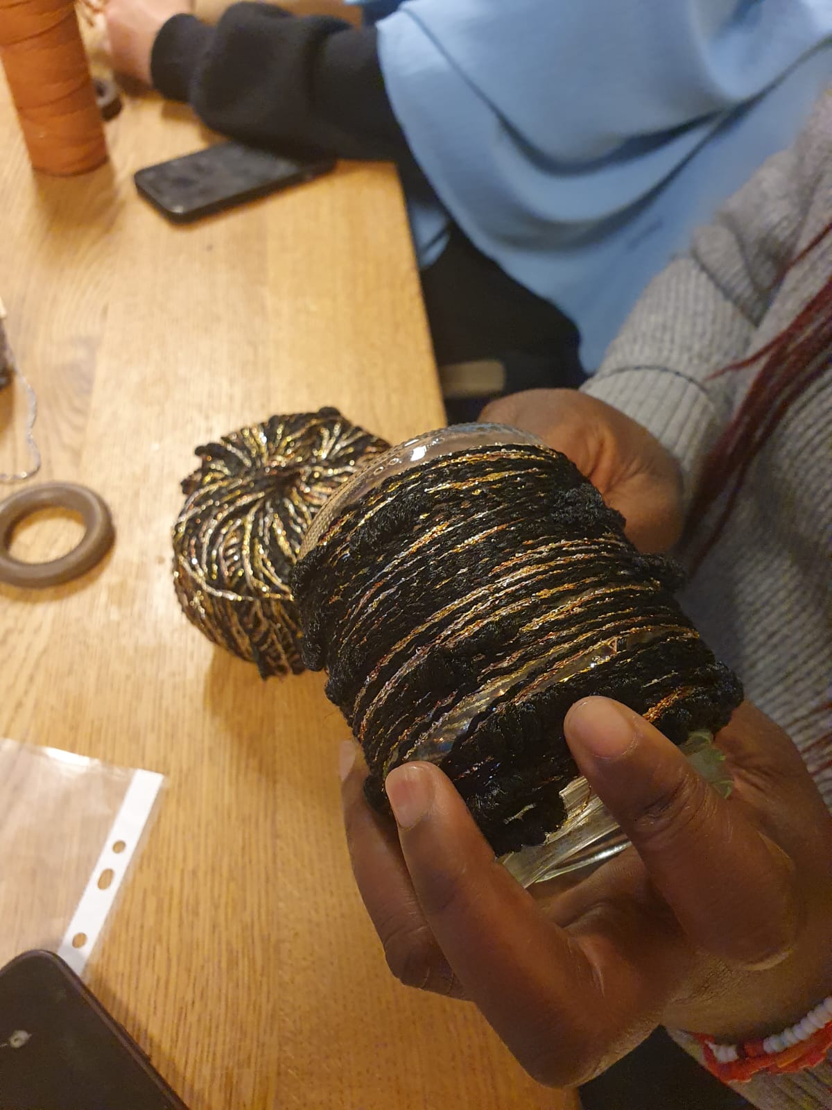Au premier étage, la table centrale déborde de bouts de tissus, de rubans récupérés, de pétales de fleurs et de copeaux de bois.. Chacun.e se servira de ce qu’iel voudra pour habiller son pot de verre recyclé…l’objectif est simple et lumineux : créer un phosphore.