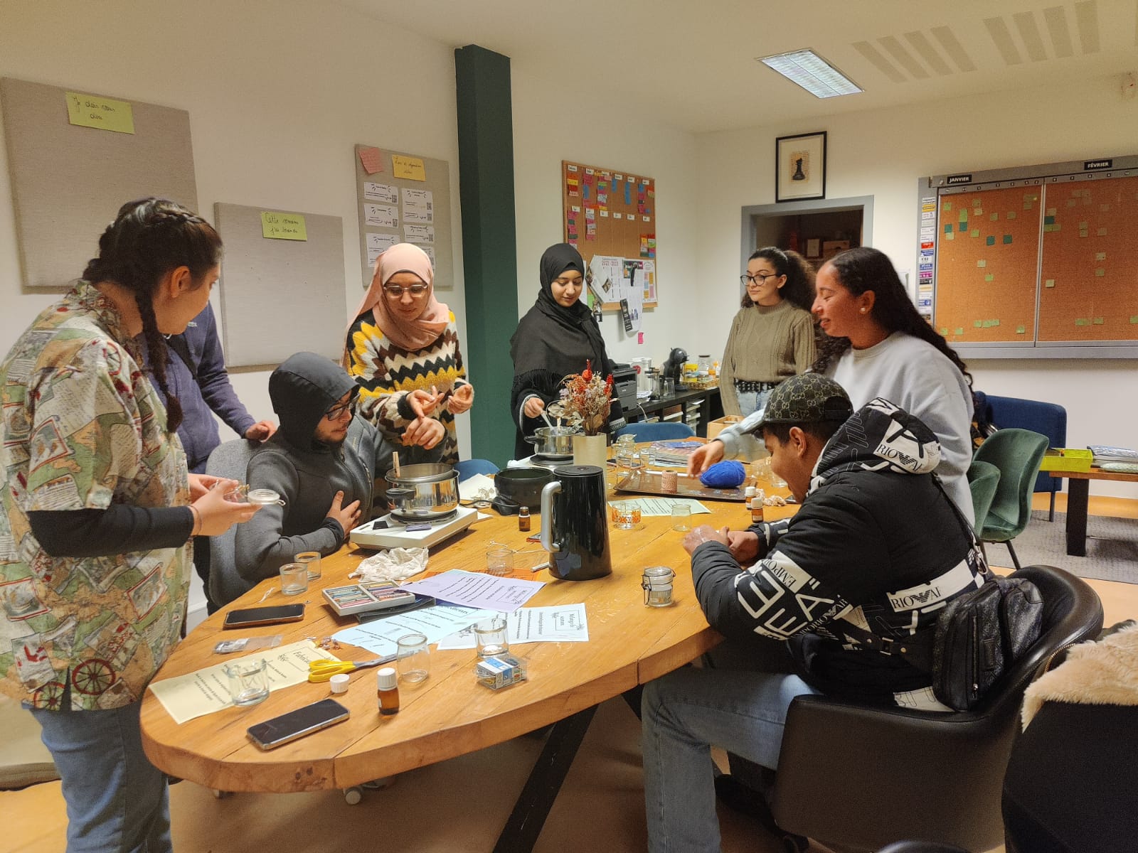 Au deuxième étage, on malaxe, on découpe, on remplit les pelures d’orange d’une cire écologique. Les doigts racontent les parfums ainsi constitués. L’objectif est de créer une bougie zéro déchet.
