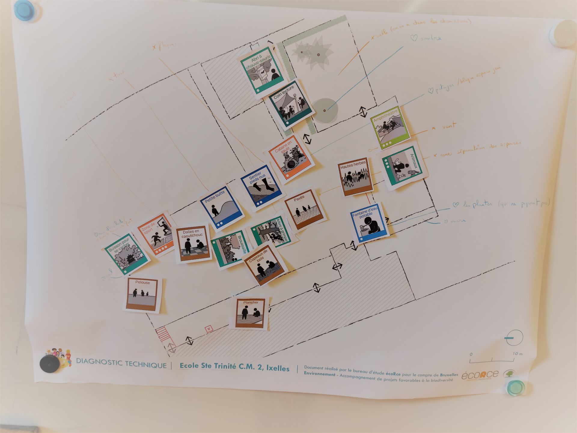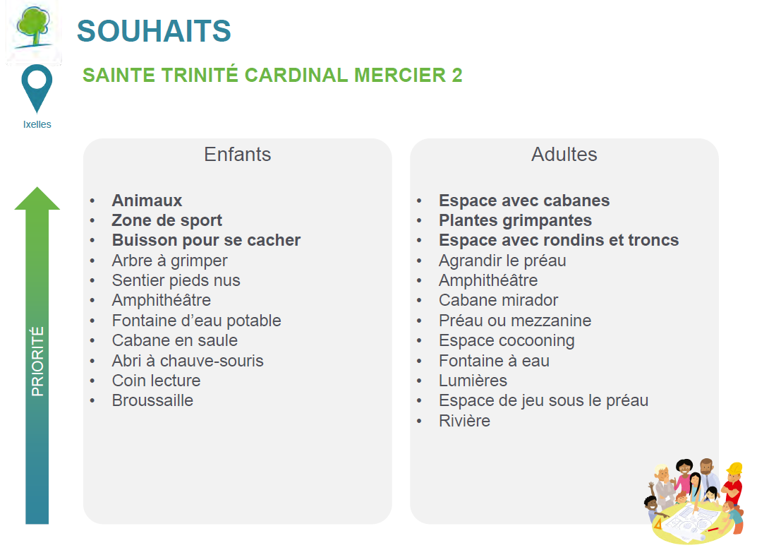 La cour de récré est avant tout un lieu d’amusement, mais le regard des adultes est nécessaire pour veiller à certains points de vigilance. Les questions de sécurité, de budget et d’organisation (notamment pour l’entretien) déterminent les contours d’un projet réaliste. Les participants acceptent de se laisser guider par les experts, qui proposent des solutions pour lever les freins. Par exemple, le fait d’avoir des aménagements qui évitent de ramener trop de saletés dans le bâtiment, ou de la végétation qui ne nécessite pas trop d’entretien. On a hâte de découvrir l’esquisse !