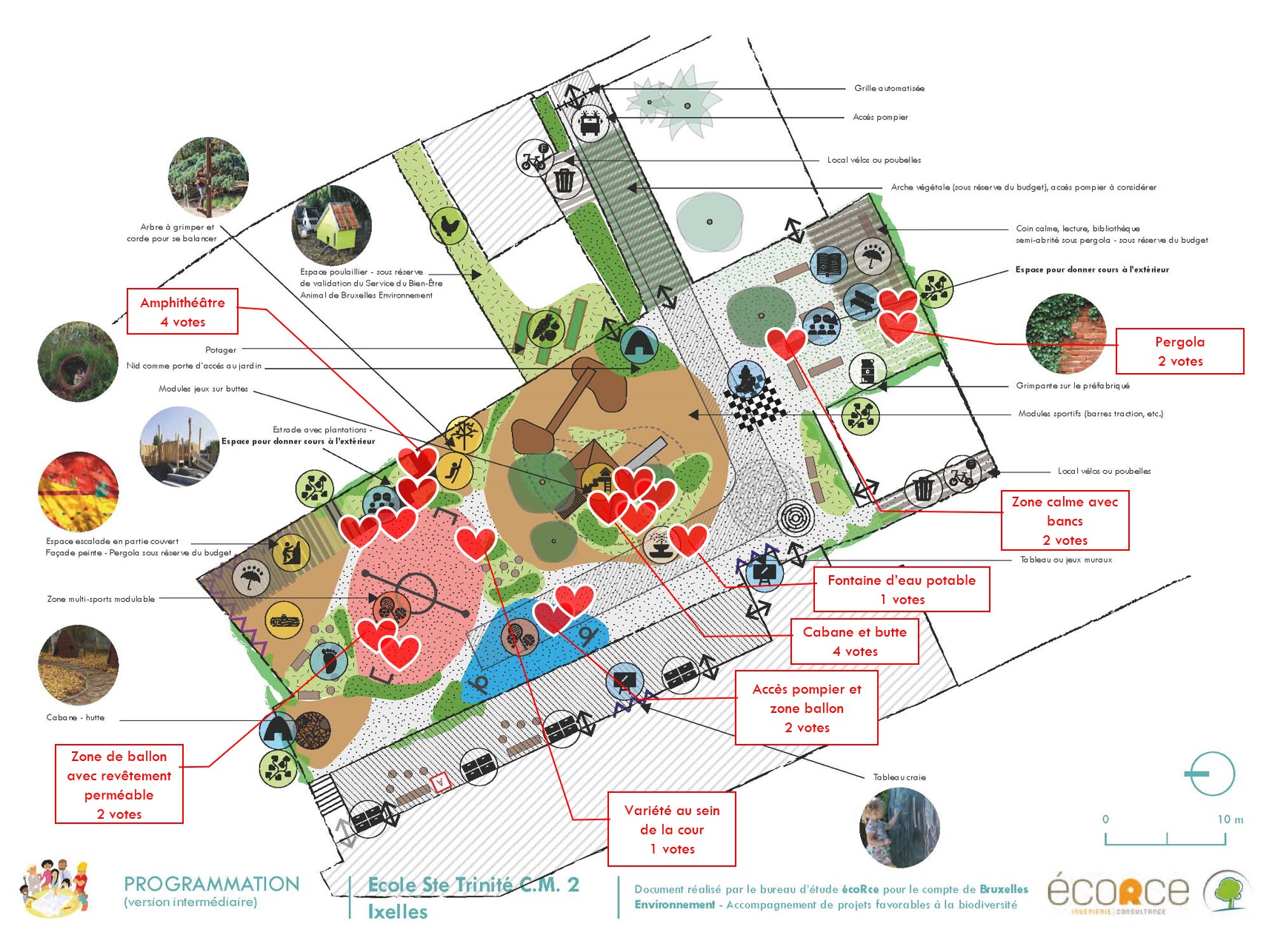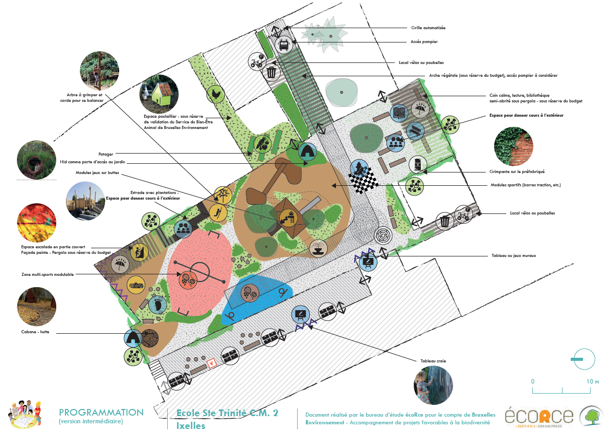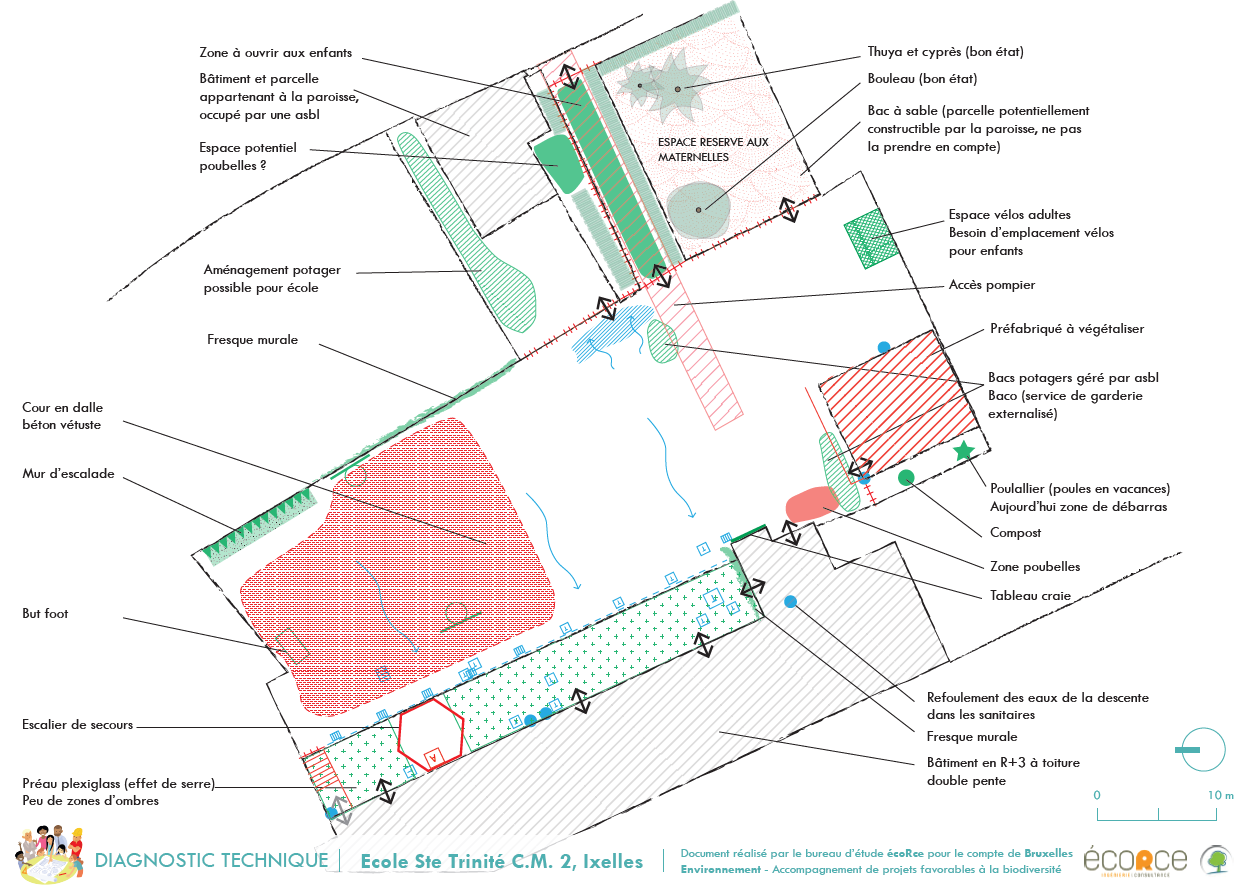prioritaires que je souhaitais mettre en œuvre. D’autres rénovations de l’école ont été menées, et nous avons finalement entamé le projet il y a un peu plus de deux ans. La cour était très bétonnée, sans espaces d’ombres ni de végétation et fréquemment inondée. Nous avons sollicité les parents et les enfants pour contribuer à un processus participatif, et faire ressortir leurs besoins et leurs envies. Nous avions l’aide d’un architecte pour imaginer le projet, mais quasi pas de soutien financier. L’appel à candidature Opération Ré-création était une belle opportunité de poursuivre le projet !