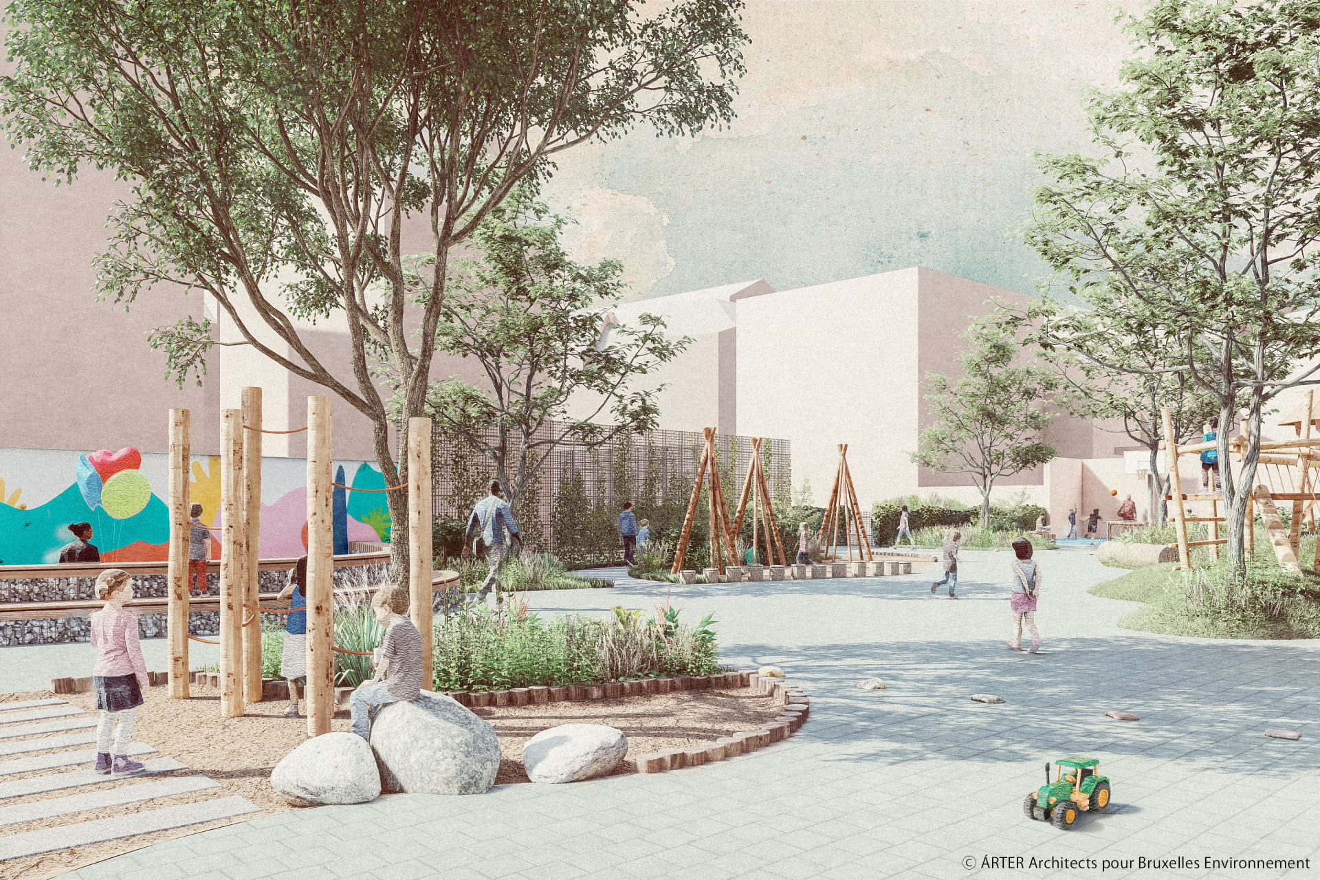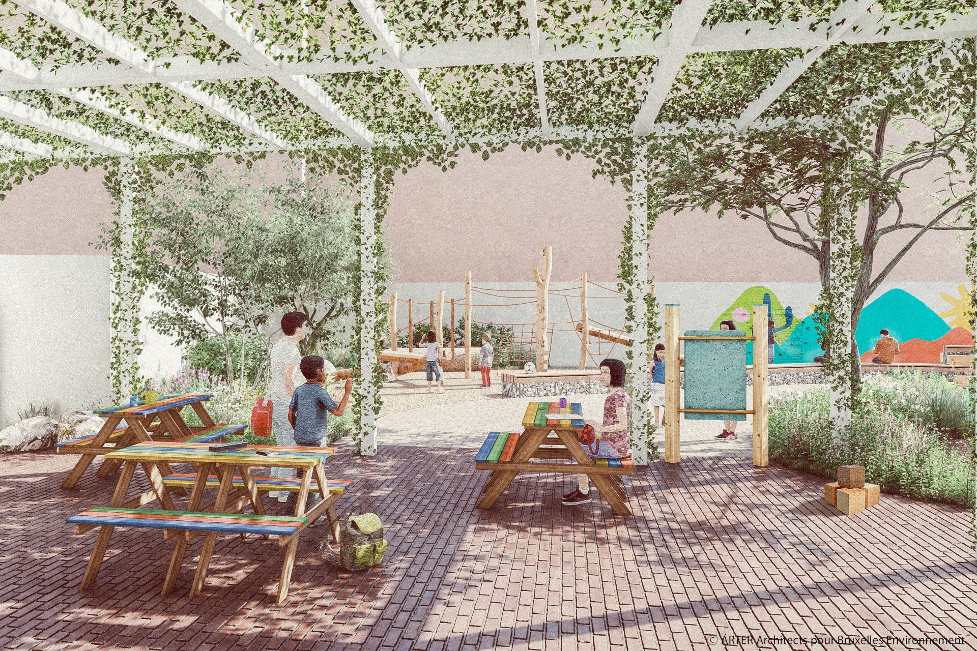 Opération Ré-création a pour objectif de transformer les cours de récréation en espaces de jeu et de ressourcement végétalisés, mixtes et de qualité, tout en amenant de la nature rafraichissante dans le quartier.
